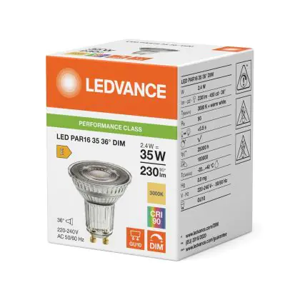 Die Ledvance LED Reflektor GU10 PAR16 2.4W 230lm 36d - 930 Warmweiß Warmweiß| Dimmbar - Ersatz Für 35W ist eine effiziente GU10 LED-Lampe und der perfekte Ersatz für Ihre konventionelle Halogenlampe mit 35W und einem GU10-Sockel, bei welchem die zwei Stifte einen Abstand von 10 mm zueinander haben. Zudem strahlt das Produkt Licht in der Farbtemperatur aus und punktet durch eine lange Lebensdauer.