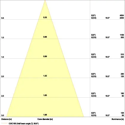 Beispiel: Wird eine Lampe mit einem Abstrahlwinkel von 60 Grad an der Decke (2,5 m Höhe) angebracht, erzeugt sie einen Lichtkegel von 2,9 Metern Durchmesser. Hat die Lampe hingegen einen Abstrahlwinkel von 120 Grad, beträgt der Lichtkegel 8,7 Meter im Durchmesser. |