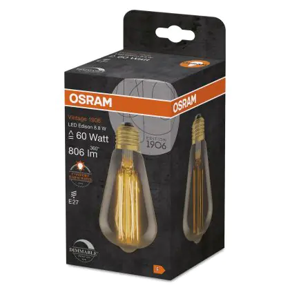Die Osram Vintage 1906 LED E27 Edison Filament Gold 8.8W 806lm - 822 Extra Warm White | Dimmable ist eine effiziente E27 LED-Lampe mit Retrodesign und der perfekte Ersatz für Ihre konventionellen 60W Lampen mit E27. Zudem strahlt sie Licht in der Farbtemperatur 2200K - Extra Warmweiß aus und punktet durch eine lange Lebensdauer.