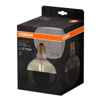Die Osram Vintage 1906 LED E27 Globe 7W 827 Spiegel Schwarz | Ersetzt 52W ist eine moderne LED-Lampe mit Vintage-Design. Sie kann ganz einfach herkömmliche Leuchten mit einem E27-Sockel, sowie einem Verbrauch von 52 Watt ersetzen und ermöglicht damit eine Energieersparnis von bis zu 90 %. Zudem punktet die Lampe mit einer langen Lebensdauer, leuchtet in der Farbtemperatur extra Warmweiß und besitzt einen spiegelschwarzen Leuchtkörper, dessen untere Hälfte klar und die obere Hälfte schwarz ist.