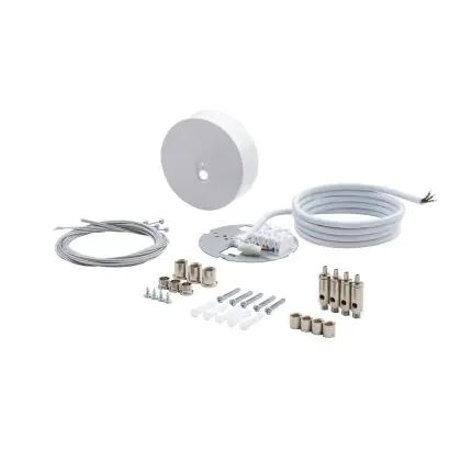 - Material und Design: Gefertigt aus robustem Stahl mit einer weißen Beschichtung, fügt sich der Aufhängungssatz nahtlos in unterschiedliche Raumgestaltungen ein.