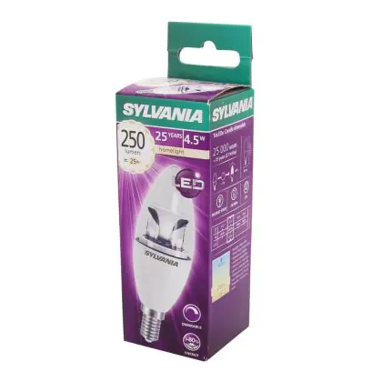 Die Sylvania ToLEDo E14 Kerze Krone Klar 4.5W 250lm - 827 Extra Warmweiß | Dimmbar - Ersatz für 40W ist eine effiziente E14 LED-Lampe und der perfekte Ersatz für Ihre konventionellen 40W Lampen mit E14-Sockel. Zudem strahlt sie Licht in der Farbtemperatur 2700K - Extra Warmweiß aus und punktet durch eine lange Lebensdauer.