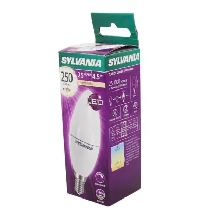 Die Sylvania ToLEDo E14 Kerze Matt 4.5W 250lm - 827 Extra Warmweiß | Dimmbar - Ersatz für 40W ist eine effiziente E14 LED-Lampe und der perfekte Ersatz für Ihre konventionellen 40W Lampen mit E14-Sockel. Zudem strahlt sie Licht in der Farbtemperatur 2700K - Extra Warmweiß aus und punktet durch eine lange Lebensdauer.